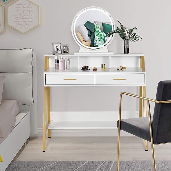 Moden computer desk with storage makeup vanity table, white marble. It features structured gold base and black ash veneer or white lacquer top. Moden computer desk with storage makeup vanity table, white marble. Rated 4.5 out of 5 stars.