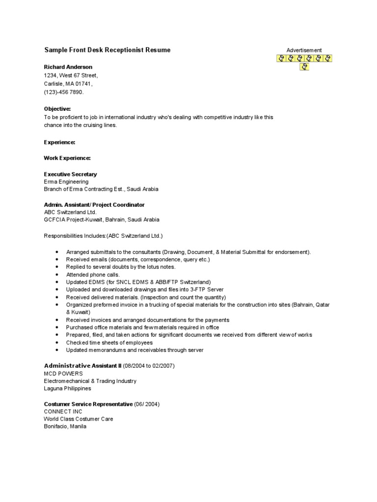 Get Front Desk Representative Pictures. Front desk representatives work at the reception area of an organization where they complete a variety of resume samples for front desk representative showcase duties like greeting guests. Seeking a management position with an organization where i can utilize my skills and experience to improve operations, increase profitability, and enhance.
